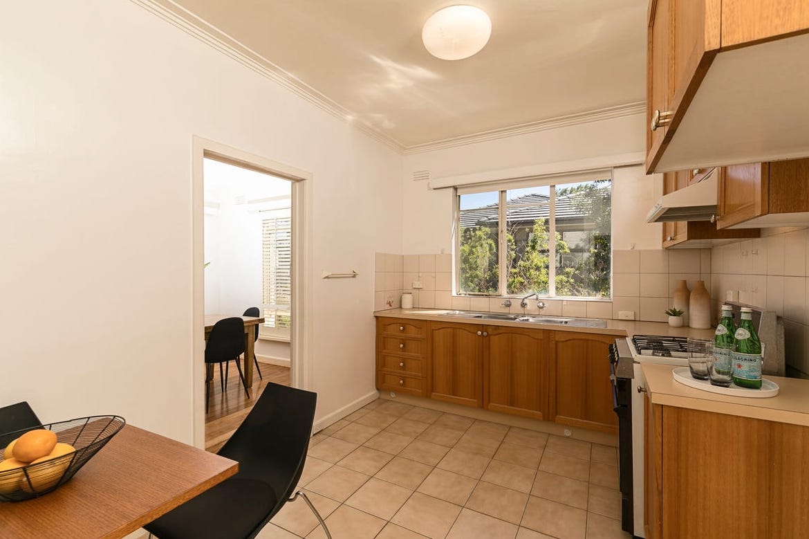Nestled inside a mid-century Melbourne apartment block, this home was given a sensitive restoration recently with architect Bonnie Mills at the helm. Home to Bonnie, her partner Ashley Raggett, toddler Sonny Raggett and the family dog Teddy, the home combines natural stone, terrazzo and walnut timber in a nod to the apartment’s heritage.