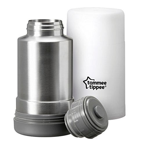 The bottle is encased in a thermal flask that's filled with boiling water; you stick your baby bottle in it to warm it up. It's basic but gets the job done, especially for shorter flights