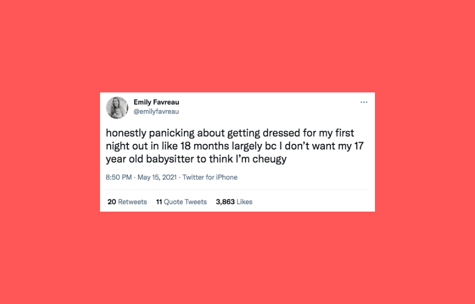 honestly panicking about getting dressed for my first night out in like 18 months largely bc I don’t want my 17 year old babysitter to think I’m cheugy