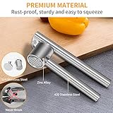 2 in 1 function 2 in 1 versatile garlic press crushing and slicing garlic 2 styles for your choice to suit which will save you precious time and make your life so much easier in the kitchen Hard aluminum alloy the garlic press has a solid highquality aluminum alloy support that can last longterm use will not rust will not be deformed