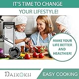 daikoku mandoline food slicer set will let you to get 0 035 inch slices of cheese vegetables onion tomatoes fruits and other food Daikoku kitchen slicer has improved design and made of superior materials also our set includes cheesecitrus grater that will last you for many years and will make the cooking process more convenient and easy Using of our slicer set will help you to save a lot of time and energy