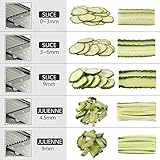 Multifunctional mandoline slicerthis vegetable cutter has 18 different types of precision cutting It can meet all your needs including straight cuts waffle and wavy cuts small julienne cuts and larger french fry cuts There are 18 different cuts ranging from 1mm to 7mm thickness safety hand guard designjuliennes mandolin cutter with safe and secure design the blades are made of food grade stainless steel and integrated into the machine blade selection and thickness are adjusted with the turn of a dial on the side of the mandoline The safety pusher and fixed pin is proposed to avoid hand injury Nonslip handle and feet fit perfectly on a smooth surface to avoid any damage during operation and make your cooking safer