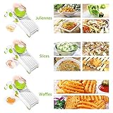 Multifunctional mandoline slicerthis adjustable slicer does everything youd want to dostraight cuts waffle and wavy cuts small julienne cuts and larger french fry cuts suitable for cutting vegetable and fruit In total there are 18 different cuts ranging from 1mm to 7mm thickness