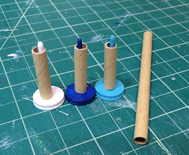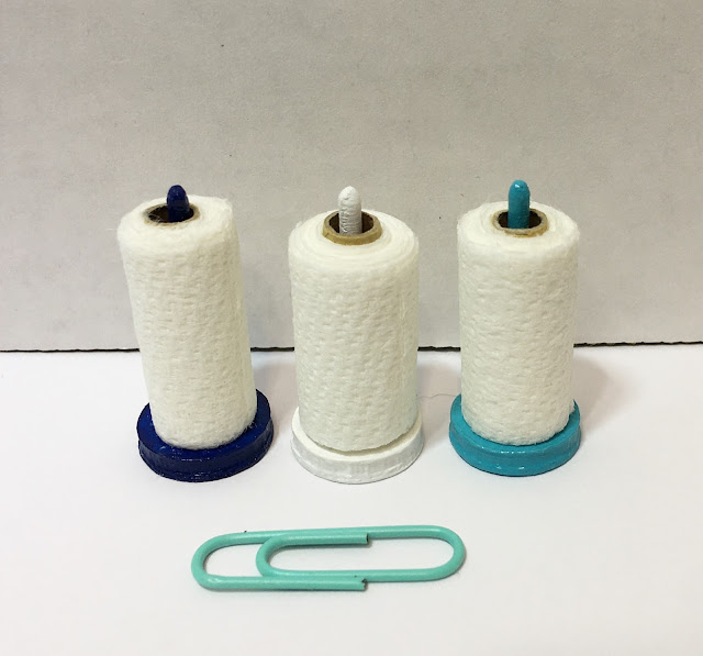 I painted them in different colors so Tasha would have a variety. I had some cardboard straws in my stash to use as the centers for paper towel rolls, then just had to make them. I cut the cardboard straws into one inch lengths, cut real paper towels into one inch wide strips, glued the "cardboard tube" onto the end of the strip and then carefully rolled them up, securing the end with more glue.