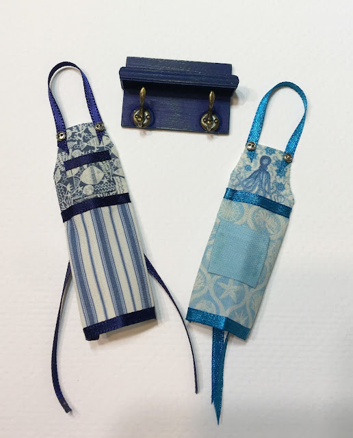I made a wee coat rack shelf to fit between the wet bar and the ovens. There's a couple hooks and a shelf where she can display framed art or kitchen accessories. I made a couple aprons to hang on the shelf, one in teal and one in blue.