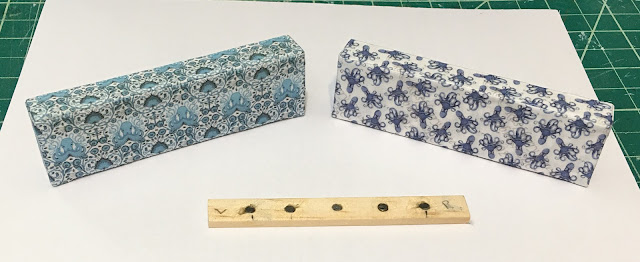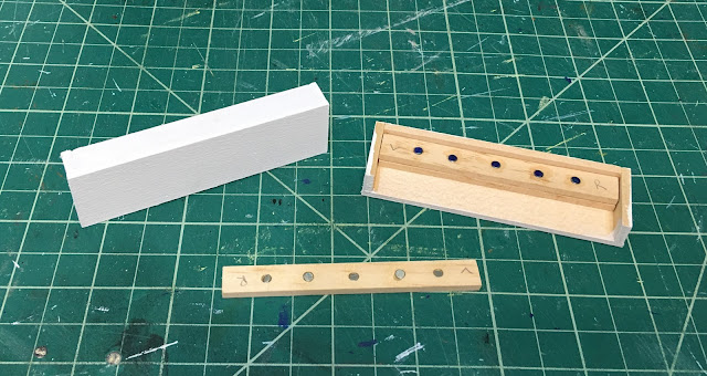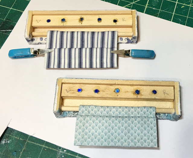 In keeping with the magnet theme in this project, I decided to make the window cornices attach to the wall with them. I built the basic cornice boxes with a strip of magnets imbedded into the wood supports, and a corresponding strip of wood with magnets to attach to the wall above the window. I made two so that Tasha can have a couple different colors and patterns and change them out as she gets the urge to play.