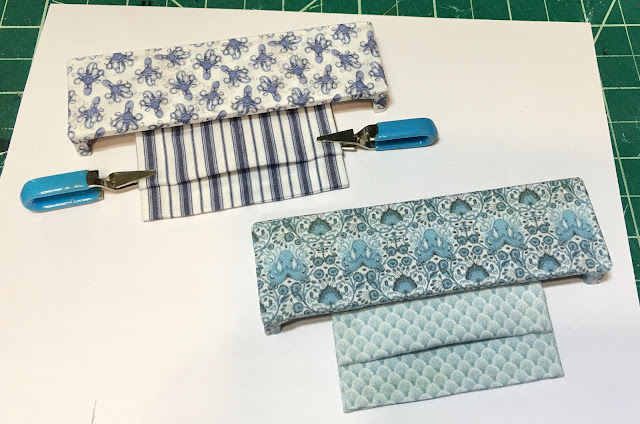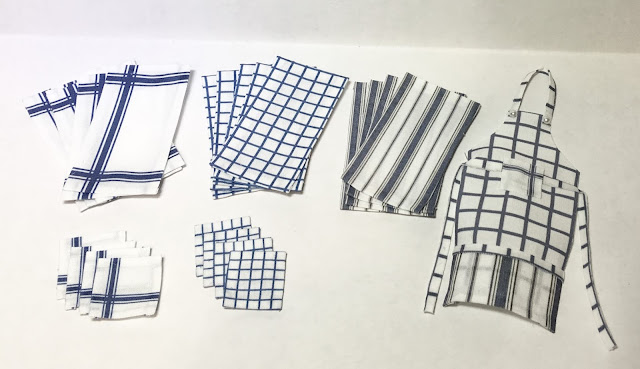 Next I made up some linens - these can be placemats and napkins or dish towels and dish cloths depending on how you hem and fold them. I'll let Tasha decide how she wants to utilize them. I also made one more apron that Tasha can wrinkle up and lay on the counter in a cooking scene.