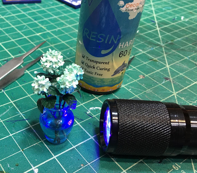Thanks to Megan, I got the courage to put the hydrangeas in a vase with "water". She reminded me about UV resin, and I had forgotten that I had a bottle and the UV flashlight waiting for a turn in my supply drawer! Thanks Megan! This task was done and perfect in minutes, no sweat, no mess, no worries!