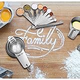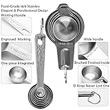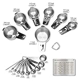 Premium foodgrade stainless steel dont worry about silicone or bpainfested plastic to touch your cookingMaking your cooking always safe and health long service life accompanied by your family all the time Complete set of 18 pcs stainless steel measuring cups and measuring spoons includes 18 14 13 12 23 34 1 cups and 18 tsp 14 tsp 12 tsp 34 tsp 1 tsp 12 tbsp 23 tbsp 1 tbsp4 tsp spoons leveler spoon 2 drings bonus magnetic measurement conversion chart